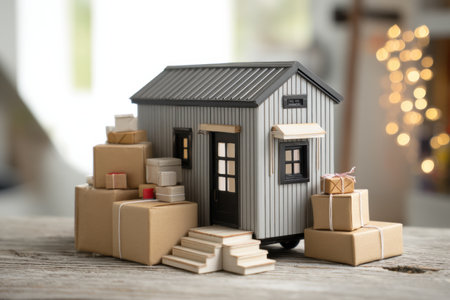 Delightful tiny house model featured with neatly stacked packages around the door, creating a warm and inviting atmosphere in a cozy indoor space.