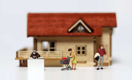 Miniature people wearing masks. Concepts about recommending wearing a mask when you're outside the house.