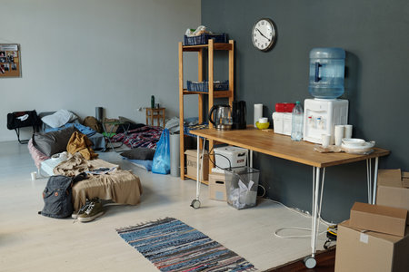 A room with a sofa and shelves filled with books. Light enters from the window. Items scattered around show daily life.