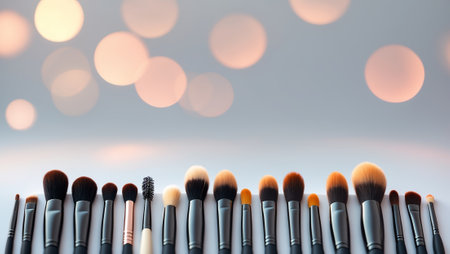 Selection of makeup brushes arranged neatly on a soft background with lights creating a warm ambiance