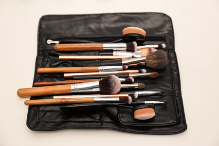 Set of makeup brushes on a light background