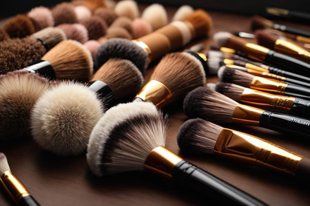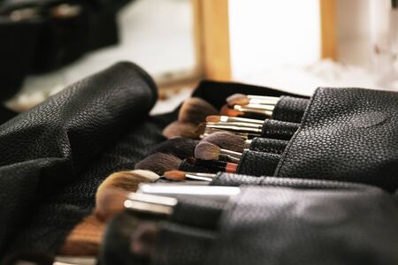 A set of professional accessories make-up artist, brushes for applying cosmetics and makeup, close-up.