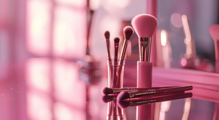 pink makeup brushes on a dark gray background. luxury cosmetics.