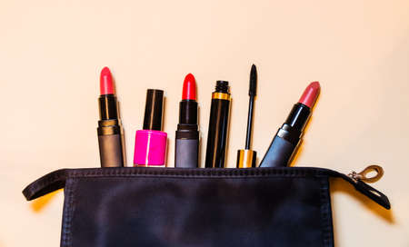 Top view of cosmetics standing out from red cosmetic bag on pink background. photo