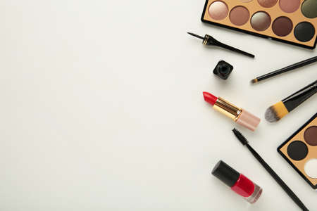 Flat lay with set of professional decorative cosmetics, makeup tools over light background, top view