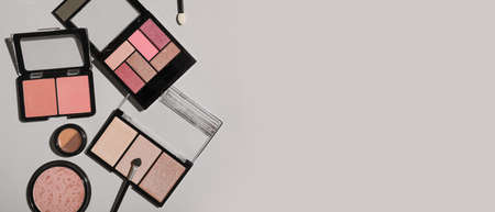 Flat lay with set of professional decorative cosmetics, makeup tools over light background, top view