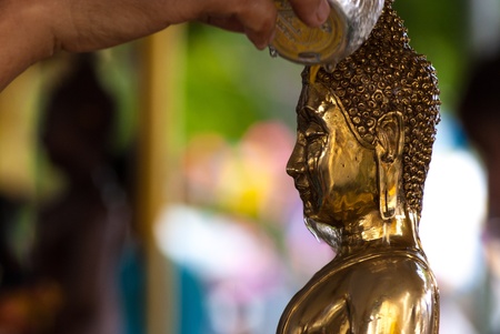 water pouring to Buddha statue in Songkran festival tradition of thailand