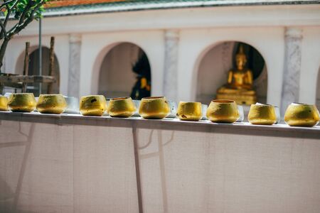 Buddhist flower offerings or gifts in bowls and rows. Buddhism religion offering in a temple