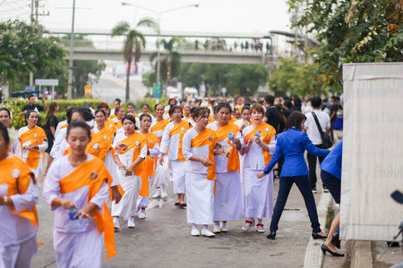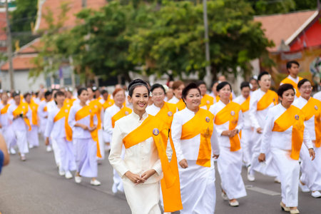 Buddhist followers with candles and flowers during Visakha Bucha Day. Vivid ceremony with Asian participants. Concept of cultural celebration, spiritual rituals, religious unity, traditional festival