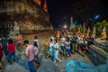 Ayutthaya ,Thailand - february 19, 2019 : Buddhists people walking (motion blur) with lighted candles in hand around a ancient temple on Magha Puja day at Ayutthaya province of Thailand.