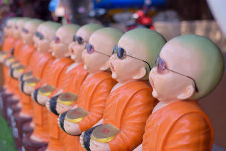 Chachoengsao, Thailand - February 19,2021 : Many novice puppets are standing in the temple.
