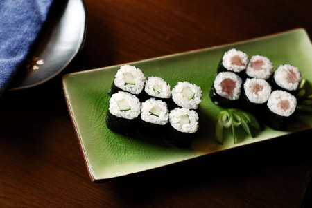 Japanese Cuisine - Sushi Roll with Cucumber, Cream Cheese and Raw Salmon inside. Nori outside