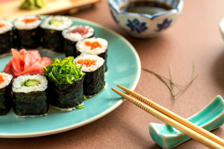 Seaweed sushi on plate has chopsticks on brown background close up, top view