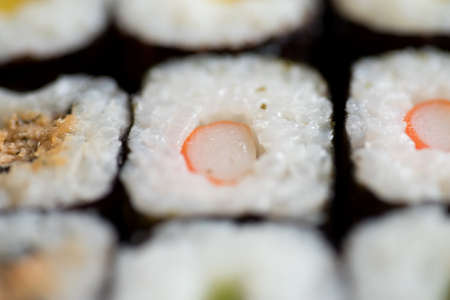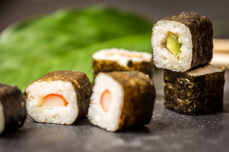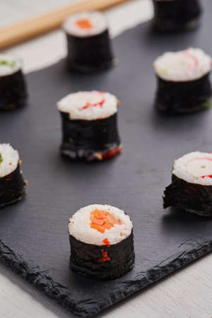 Japanese sushi rolls on a wooden board, close-up, selective focus
