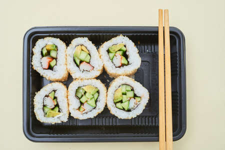 Top view of small black container filled with freshly made sushi and served with chopsticks on white surface