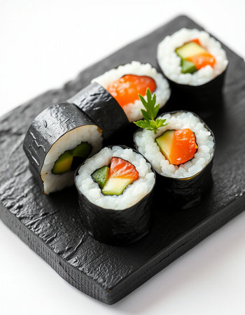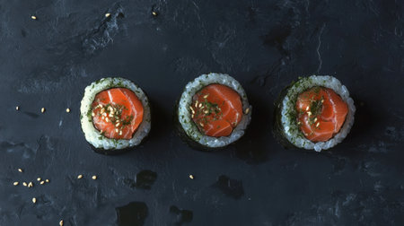 Salmon sushi rolls with rice, seaweed, and avocado, styled with precision on a dark slate background.