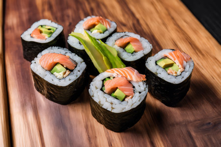 Fresh seafood maki sushi plate with avocado generated by artificial intelligence