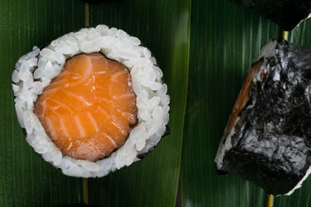 on a bamboo leaf, close-up, Japanese rolls with red fish