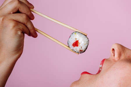 Close up macro of lips with Sushi roll. Lady eating healthy japanese food. Beauty Fashion portrait