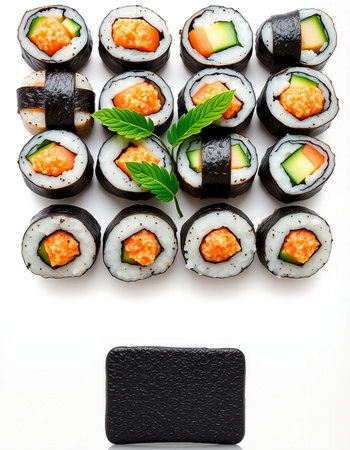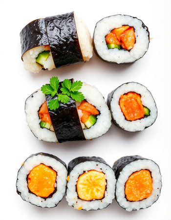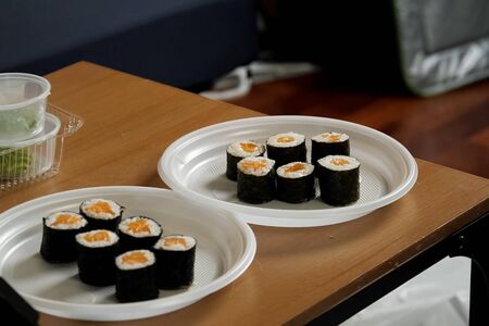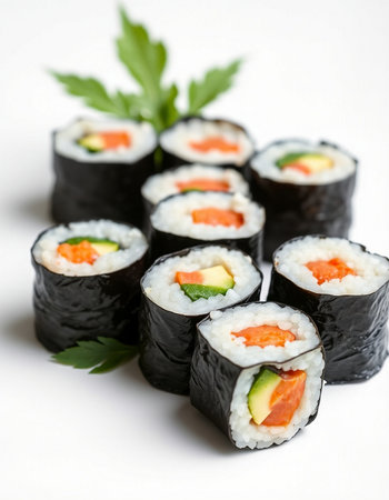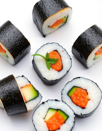Sushi rolls isolated on white background. Japanese food restaurant delivery.