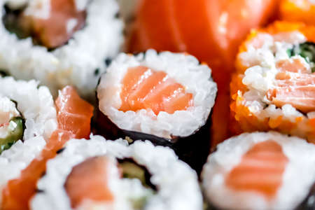 Close up and selective focus of salmon sushi roll maki. Sushi menu. Japanese food.