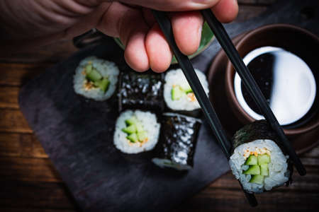 Female hand takes chopsticks sushi rolls with Chinese chopsticks. Lying on a black wooden board. View from above.
