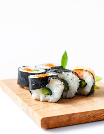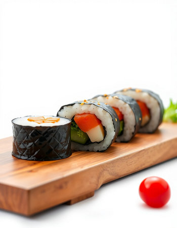 Close-up of sushi rolls with cucumber and carrot on a wooden cutting board