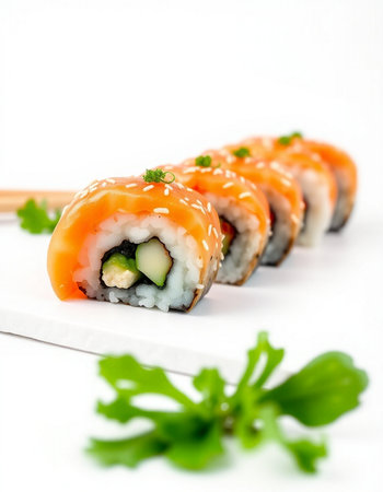 Japanese Cuisine - Sushi Roll with Salmon, Cucumber, Cream Cheese and Raw Salmon inside. Served on White Background