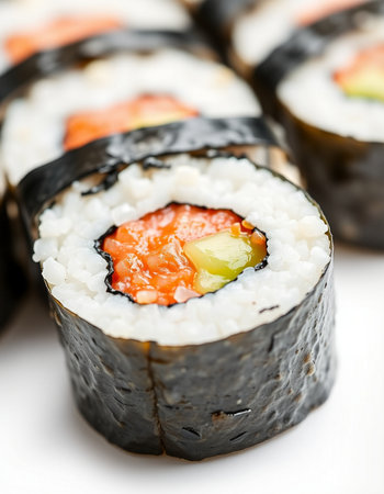 Classic maki sushi with rice and salmon in nori seaweed. Japanese meal. Close up shot. Soft focus.