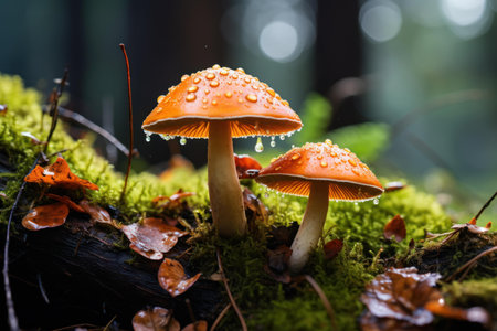 A captivating image of several mushrooms growing on a damp log in a forest. Water droplets adorn their vibrant caps.