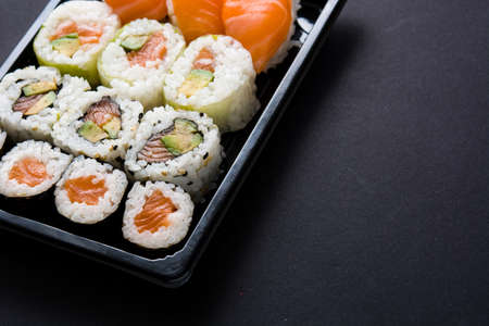 Japanese food: maki and nigiri sushi set on black background. Copyspace
