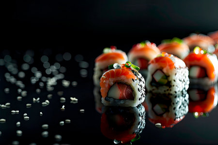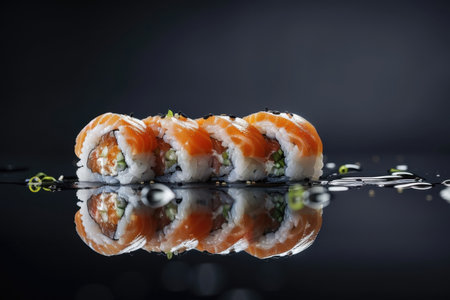 Close-up of four salmon sushi rolls with reflections on a black surface.