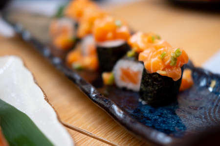 California roll topped with fresh salmon and salmon roe. Sushi Menu. Selective focus