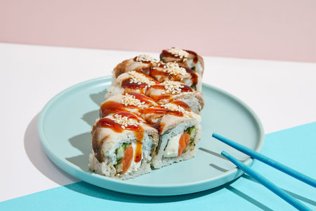 Canada Maki roll with eel on modern colored background. Sushi roll with salmon, cheese, cucumber inside, eel and unagi sauce outside. Unagi maki sushi in minimal style. Japanese menu concept