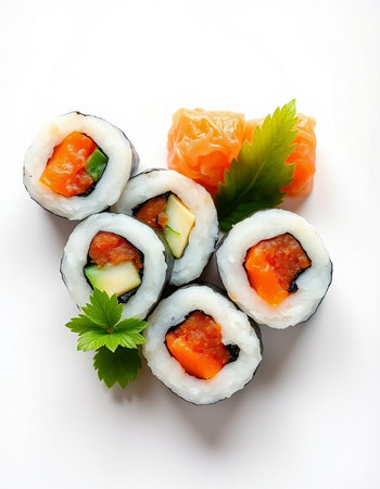 inimalistic sushi maki rolls with fresh salmon on a clean white background