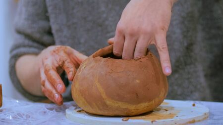 Potter female kneads a piece of clay with her hands in her Studio workshop. Pottery made of clay with their own hands.