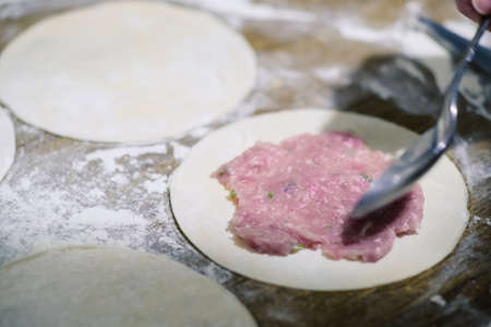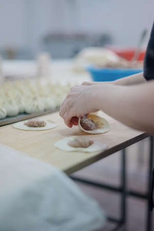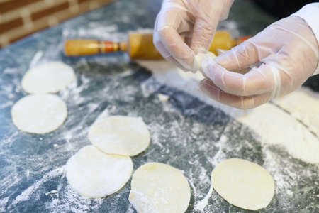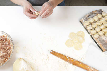 Woman cook sculpts dumplings with his hands, close-up. On the table is minced meat and rolled circles of dough