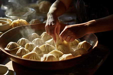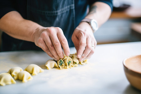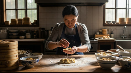 A chef skillfully prepares dumplings filled with fresh ingredients in a bustling kitchen, showcasing the artistry of culinary techniques and flavors.