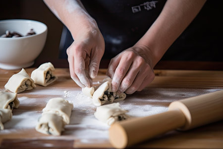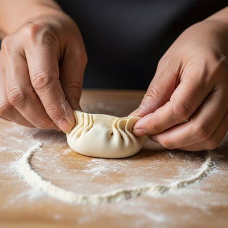 A close-up view of hands expertly crafting traditional dumplings with flour on a wooden surface, showcasing the culinary skills involved in making authentic cuisine.