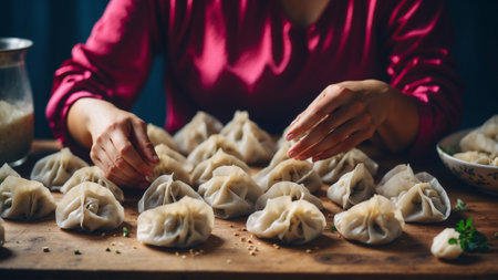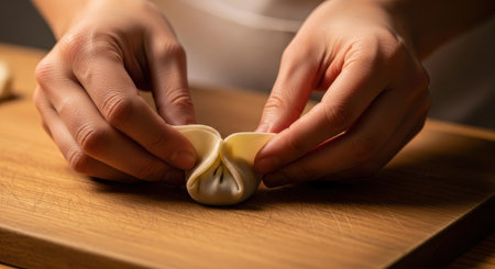 A pair of hands skillfully shaping dumplings on a wooden surface dusted with flour. The warm kitchen atmosphere evokes tradition and comfort through culinary creativity.