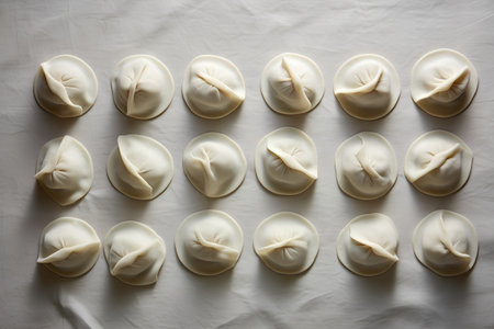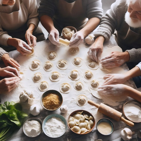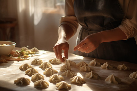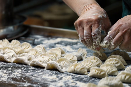 Hands skillfully sprinkle flour over freshly made dumplings, creating a delicate layer. The warm kitchen atmosphere enhances the art of culinary creation, inviting flavors and tradition.
