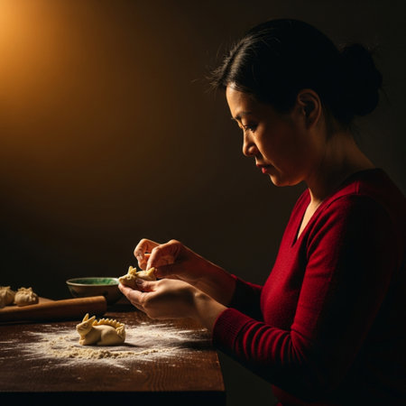 A skilled chef prepares traditional dumplings in a warm kitchen, showcasing meticulous technique and passion for homemade cuisine amidst a dusting of flour.