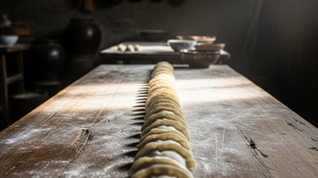 Cinematic wide shot showing uncooked Jiaozi dumplings lined up on a rustic wooden table within a tra