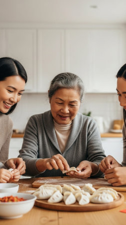 An intimate, centered medium shot capturing the intergenerational ritual of Lunar New Year dumpling