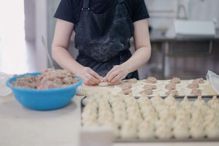 A woman in the kitchen sculpts homemade dumplings or semi-finished products. The cook wraps the minced meat from beef into the dough.