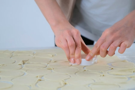 Young woman is cutting circles of dough for cooking dumplings using special form on kitchen at home, hands closeup. Process of cooking dumplings. Minced meat, dough and rolling pin on the table.