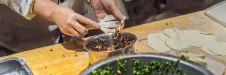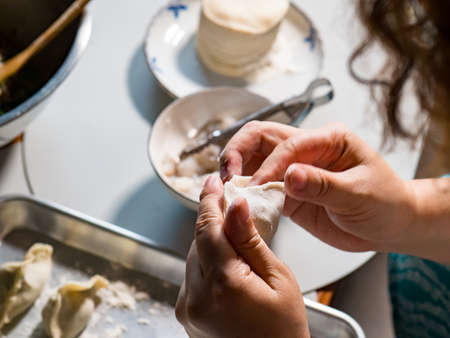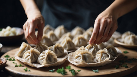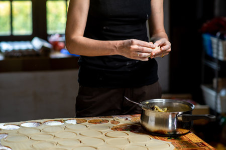 Close up of a cook's hands working with dough, shaping and preparing traditional Asian dumplings on a wooden table