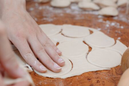 The hands of a woman cook cooked on a table of flour dough and make vareniki