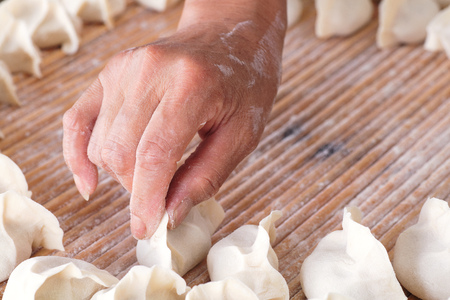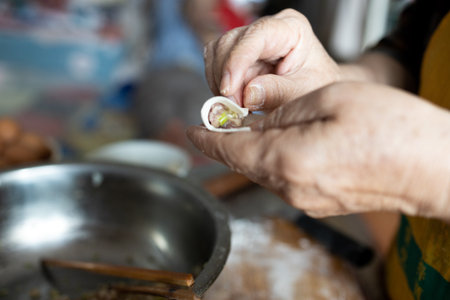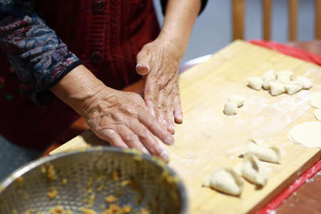 Chinese senior woman making Asian Chinese dumplings with meat or vegetable filling at home.