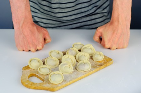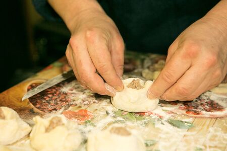 homemade dumplings in the kitchen without decorations. making dumplings with minced pork, beef and chicken